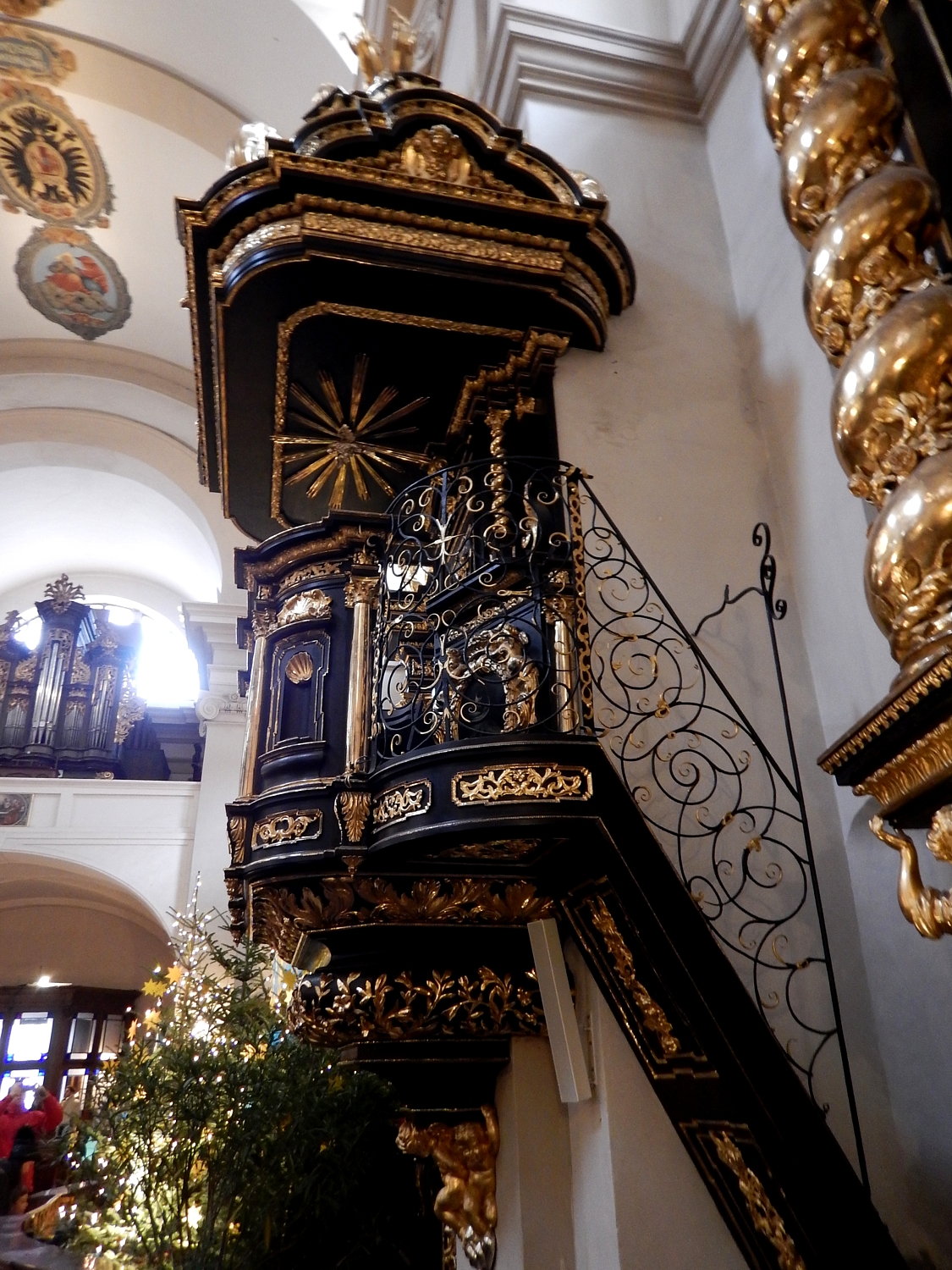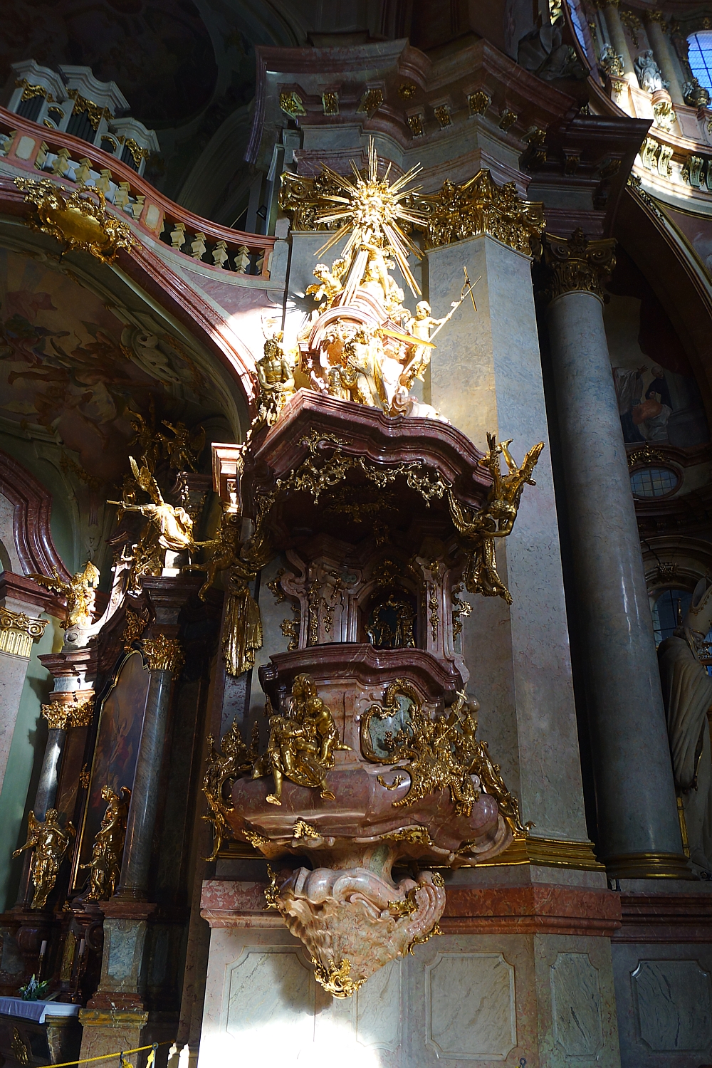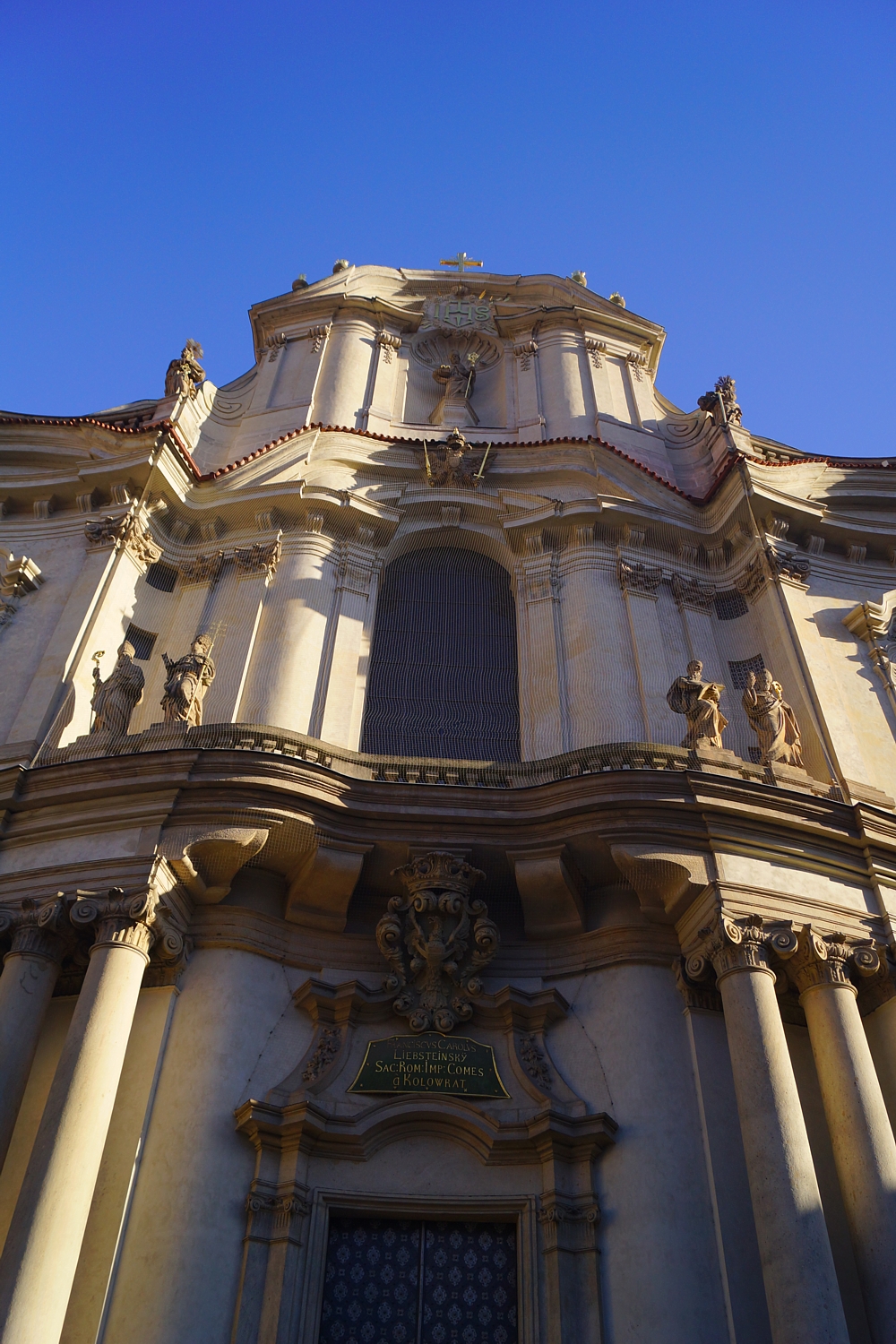 L’église n’a été achevée qu’en 1735, mais il y avait déjà des traces d’une paroisse à cet endroit au XIIIème siècle. Elle présente quelques particularités intéressantes : d’abord, énorme de l’extérieur, elle affiche des dimensions bien plus modestes à l’intérieur, dues à un effet d’optique et à l’épaisseur des murs. Ensuite, son plafond peint et son lustre font partie des plus beaux ornements de toutes les églises de Prague. Enfin, des concerts de musique classique y sont donnés presque tous les jours, voire plusieurs fois par jour pendant la haute saison.